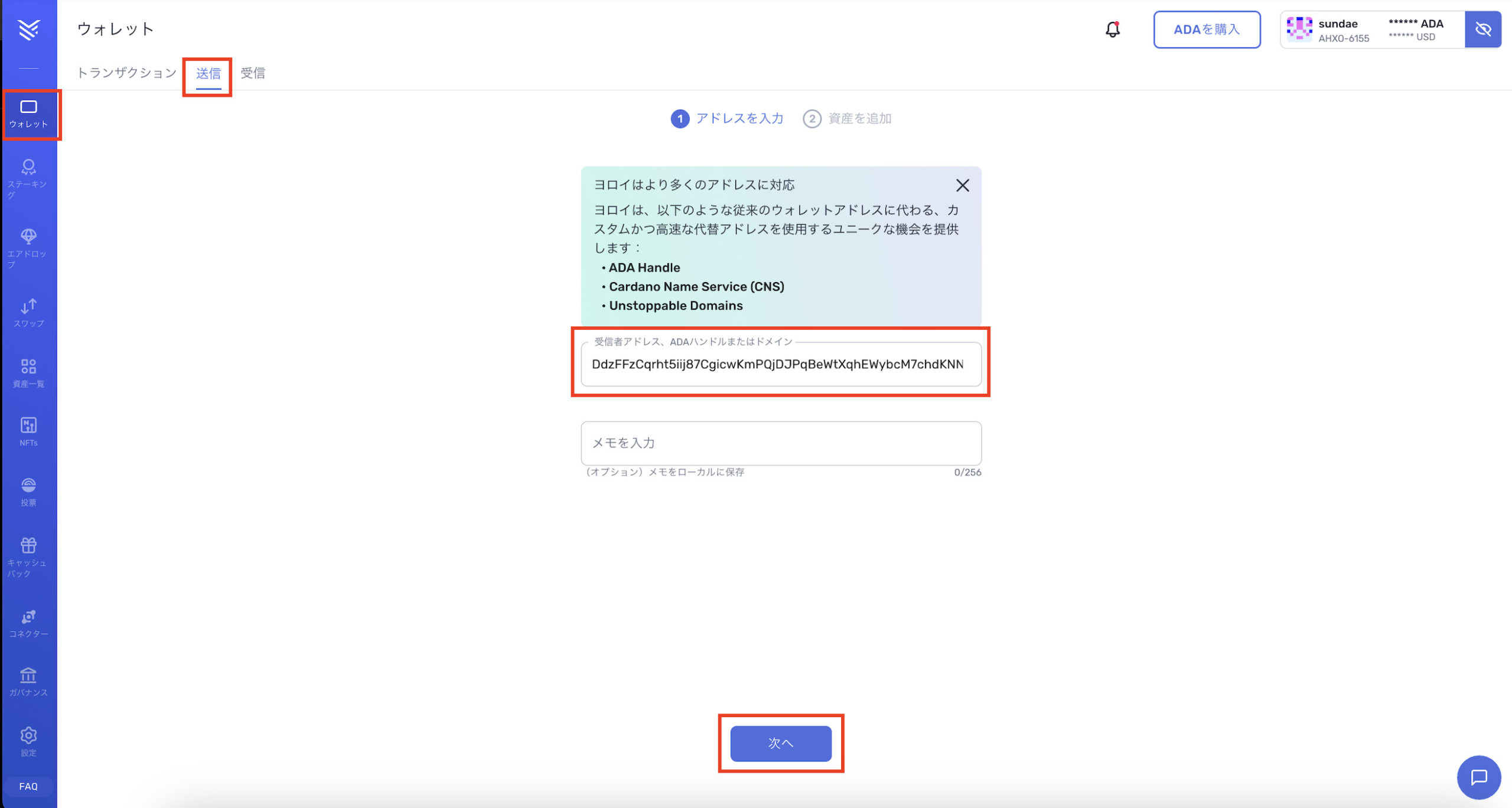 2.Yoroiウォレットの送金ページで、コピーした入金アドレスを貼り付けて「次へ」をクリックしてください
