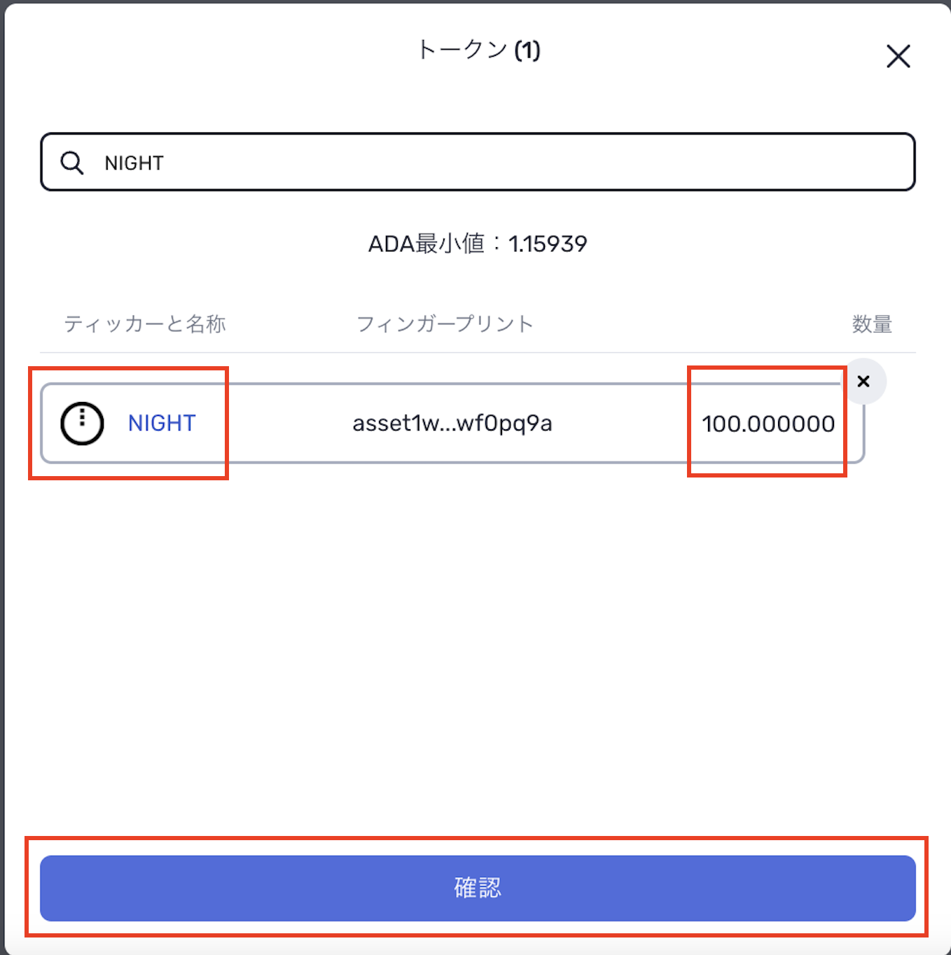 4.NIGHTトークンを選択し、送金したい枚数を入力し「確認」をクリックしてください