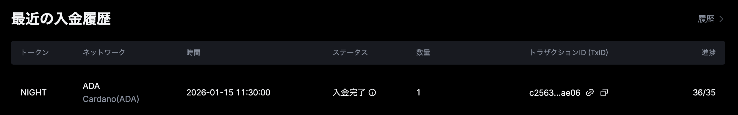 7.取引所のウォレットを確認し、NIGHTトークンが着金していることを確認してください