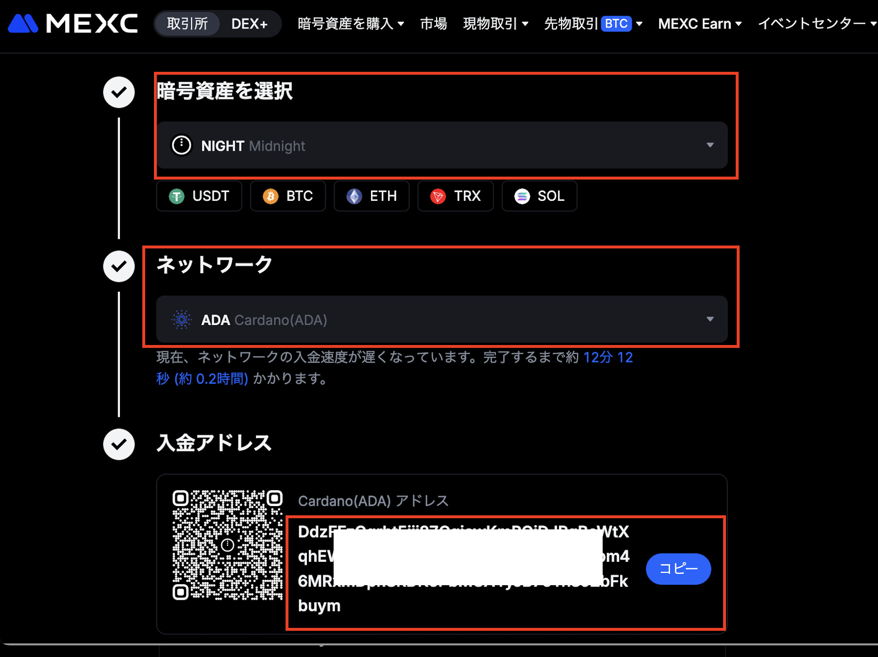 1.取引所のウォレットを開き、NIGHTトークンの入金アドレスをコピーします(参考として、MEXCという取引所で説明しています。安全である確証はありませんので、ご注意ください。)