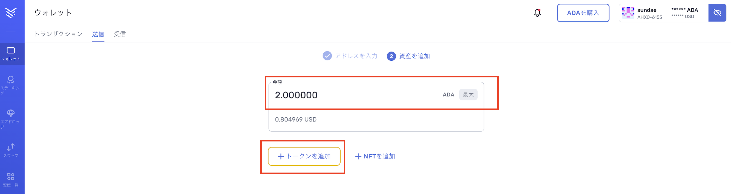 3.2ADAほどを入力し(ADAはトークンを送る際に、ガス代として必要です)、「トークンを追加」をクリックしてください