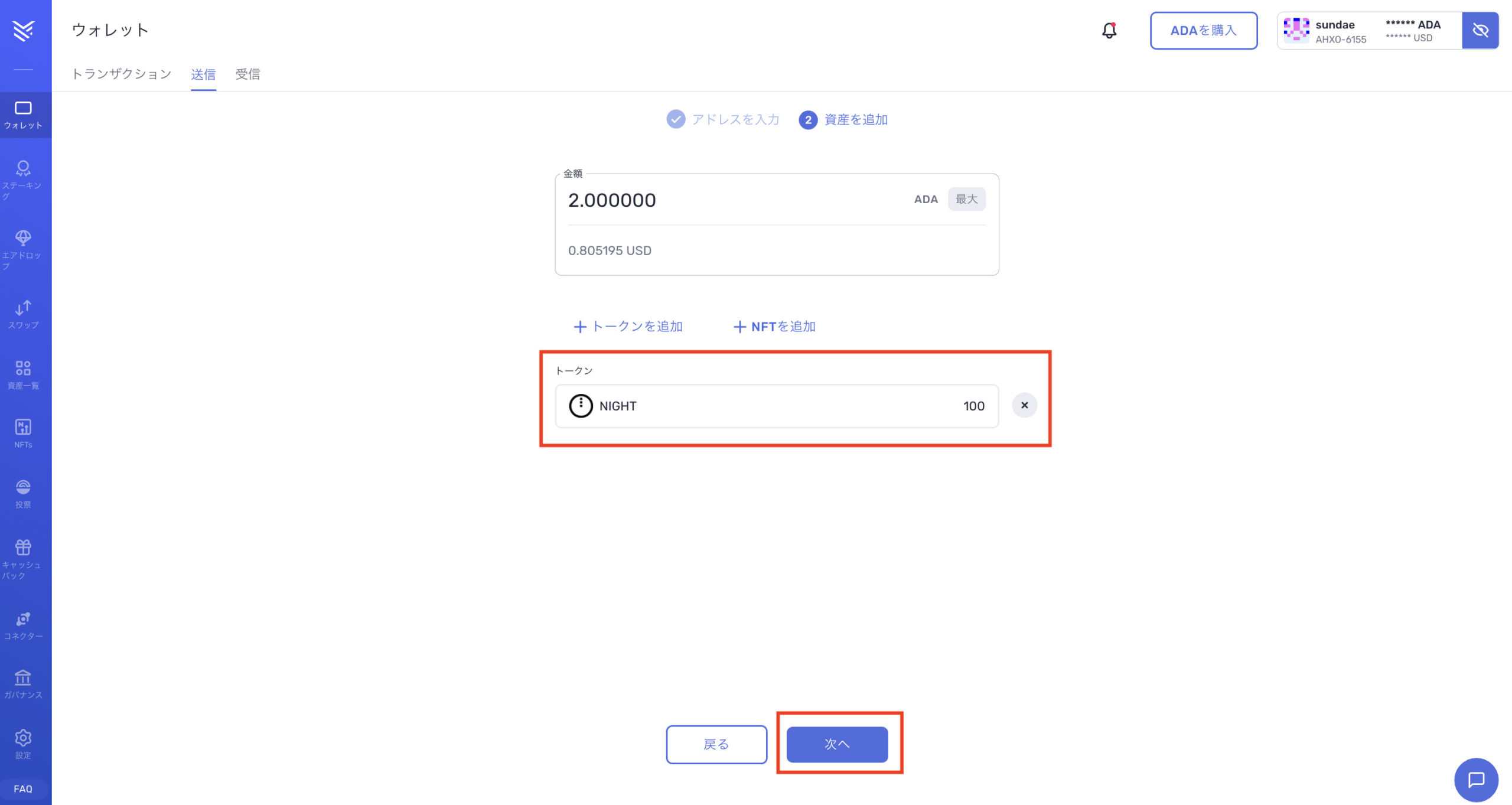 5.NIGHTトークンが追加されていることを確認し、「次へ」をクリックしてください